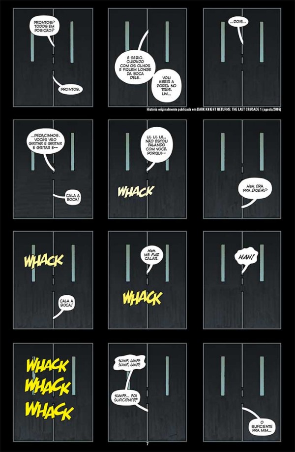 [dropcap size=small]A[/dropcap] Hq, parte da premissa de mostrar os acontecimentos que antecedem e conspiram para um trágico destino para Jason Todd nas mãos do Coringa neste universo. A atmosfera proposta por Miller e Azarello nos conduz de forma simples e eficaz, revelando um relutante Batman/Bruce, que agoniza ao sentir os anos de combate ao crime serem cobrados de forma sintomática em seu corpo, onde dores, dormências e falta de vigor são pontuados em momentos cruciais da incansável luta do Cavaleiro das Trevas e que revelam que se o mesmo insistir nesta cruzada os resultados deste desgaste podem levar o Homem-Morcego a pendurar seu traje de forma não tão agradável.