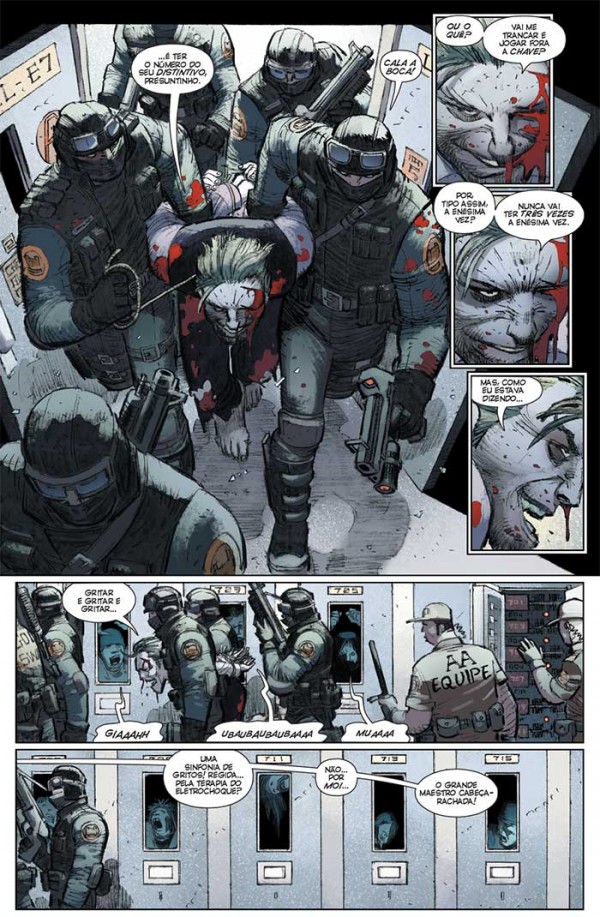 Podemos ver toda a maestria e força do traço de Romita Jr, em uma pagina onde temos vários recortes com a variação das expressões do Coringa ao fumar um cigarro e narrar uma inusitada metáfora de um garoto com o pescoço quebrado e sua visão singular do mundo…